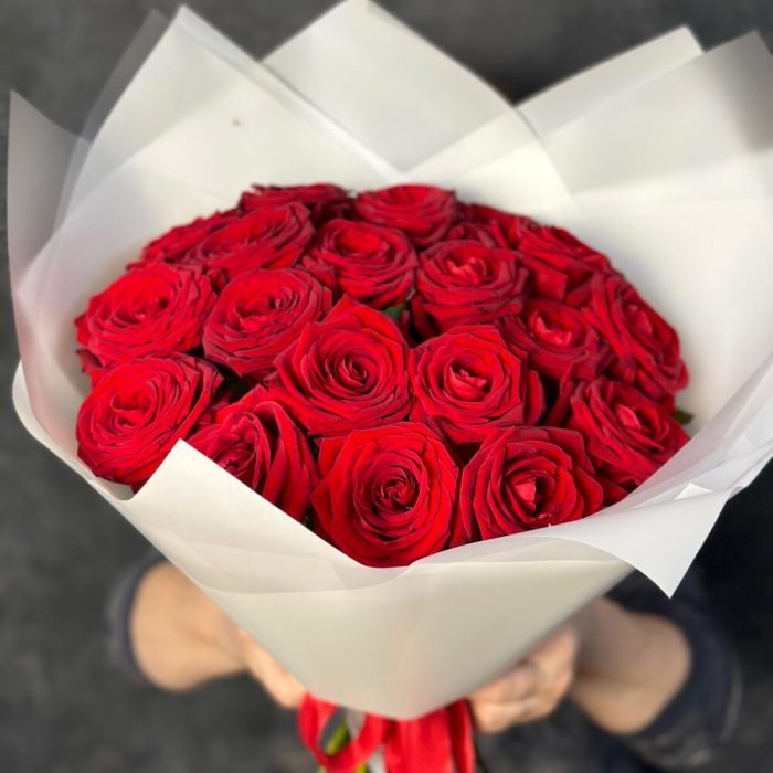 Лента атласная – 1 шт.Стильная упаковка – 1 шт.утеплитель букета – 1 шт.роза ред наймоми – 19 шт.